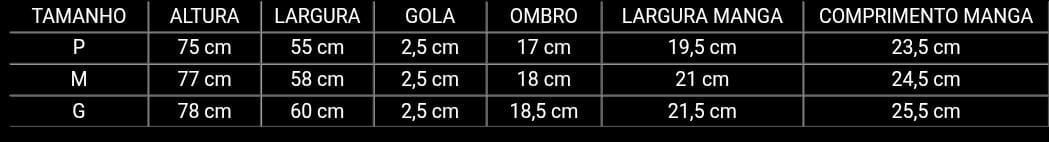 • Tamanhos: disponível nos tamanhos P, M, G— verifique tabela de medidas pra garantir o caimento que você gosta.TABELA DE MEDIDAS: